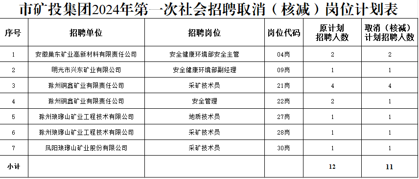 根據(jù)《滁州市興滁礦業(yè)投資集團(tuán)有限公司2024年第一次社會(huì)招聘公告》規(guī)定,經(jīng)對(duì)各崗位報(bào)名情況篩查審定,結(jié)合資格復(fù)審情況,部分崗位報(bào)名情況未達(dá)到開考比例,經(jīng)研究決定取消(核減)以下崗位招聘計(jì)劃: